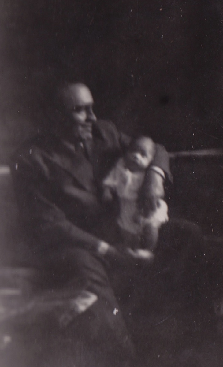 Rare photo, certes floue, de Georges souriant avec Pierre-Yves en 1949